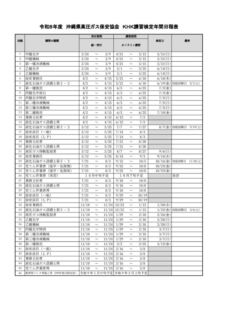 - お知らせ令和8年度 沖縄県高圧ガス保安協会 講習検定 年間日程表